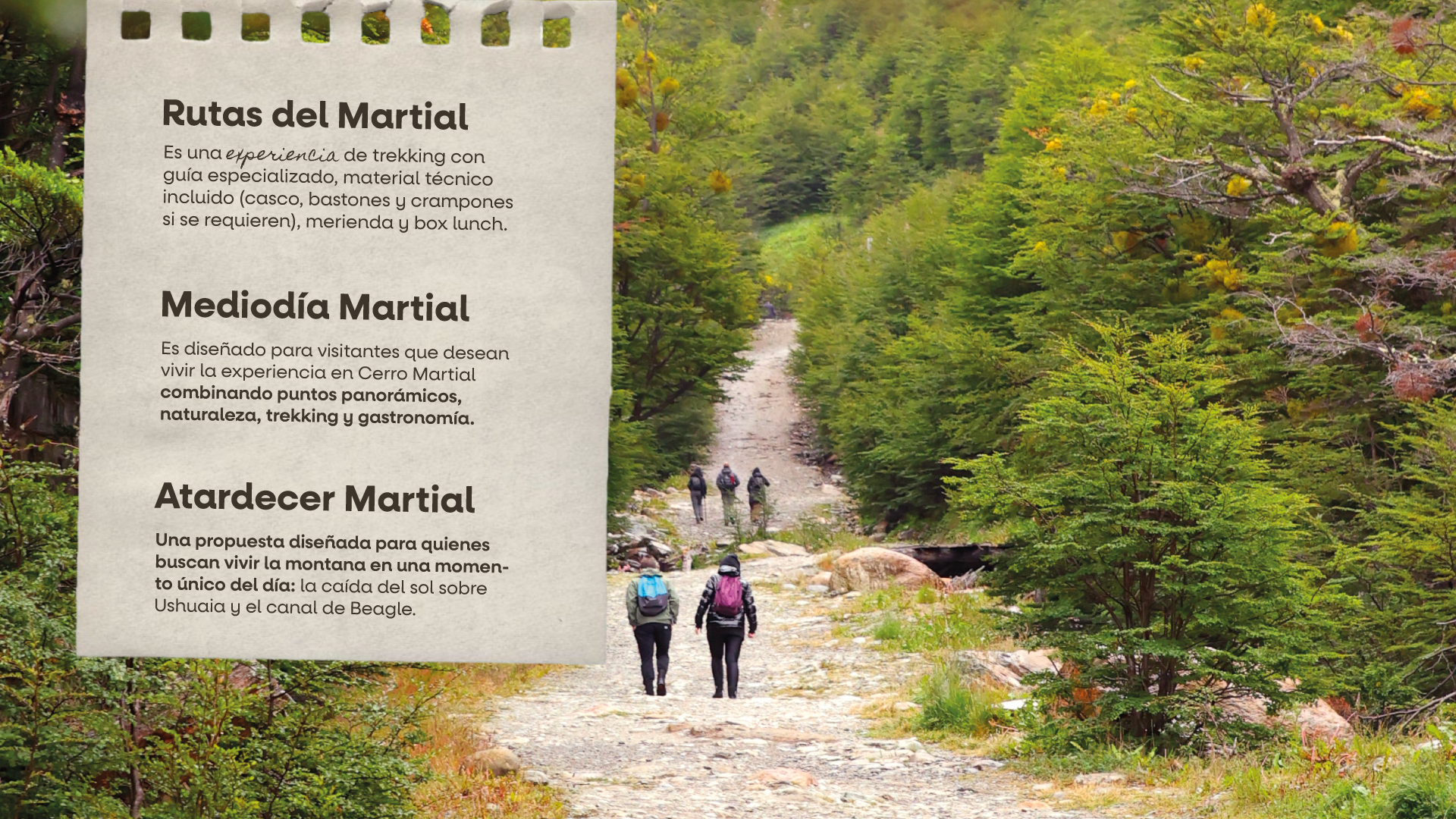una panorámica de 180° desde el Canal Beagle. Recorre las aristas y riscos del Cerro Bridges, la Cumbre Cerro Martial, y explora el bosque después de atravesar la cascada del Glaciar Sur. Más adelante, en el Mirador de las Lagunas, contemplarás tres lagunas en un valle de altura, enmarcadas por un paisaje vibrante.